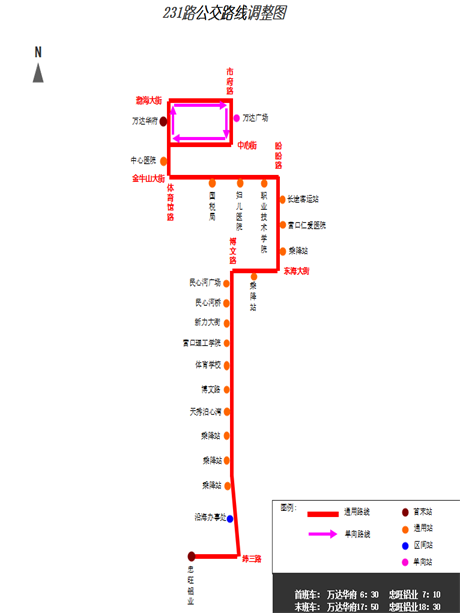 開(kāi)往萬(wàn)達(dá)廣場(chǎng)方向:7:10—7:45/17:20—18:00(經(jīng)停沿海辦事處時(shí)間預(yù)計(jì)7:13—7:48/17:23—18:03)。